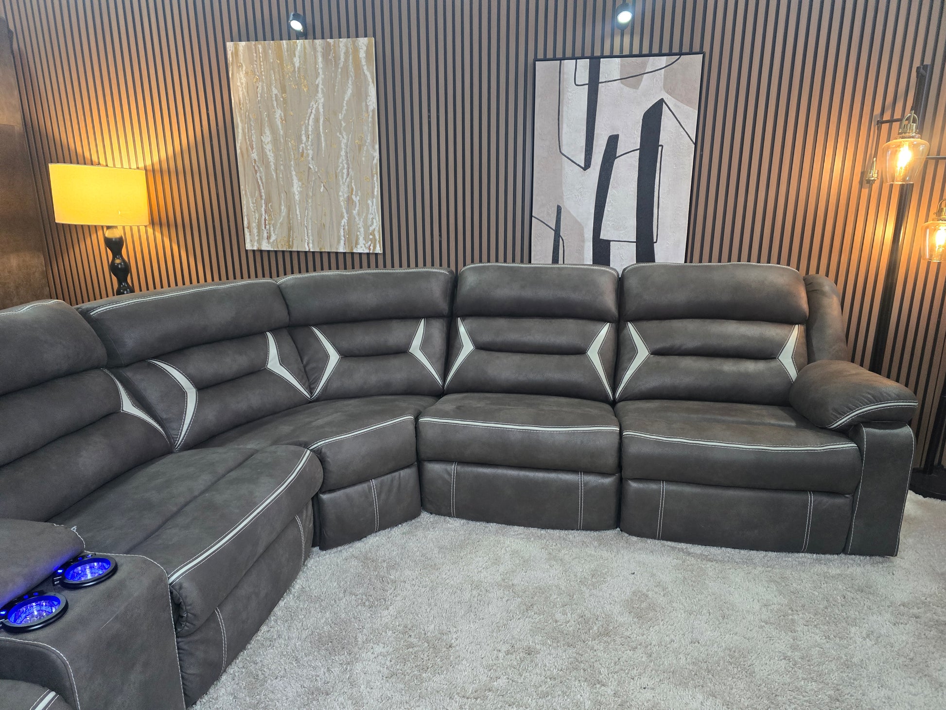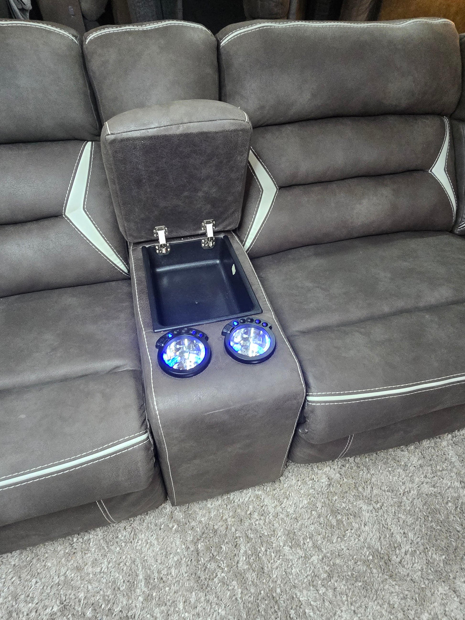Lift-top storage console includes 2 cup holders with blue LED lighting